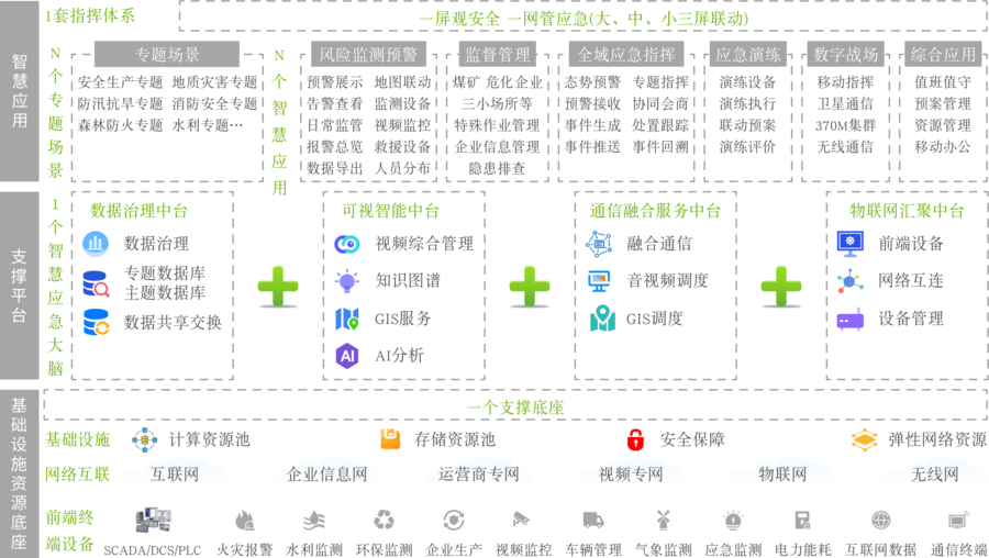 智慧应急解决方案构建多层级体系,以“1套指挥体系 + N个专题场景 + 多中台支撑 + 基础设施底座”为核心逻辑,借1套指挥体系打造安全生产、地质灾害等多专题场景,覆盖风险监测、应急指挥等全流程,实现“一屏观安全、一网管应急”;以智慧应急大脑为中枢,依托数据治理、可视智能、通信融合、物联网汇聚四中台提供数据与智能等支撑;并整合资源池、安全及网络资源,通过多网互联接入前端设备,保障方案高效运转,全面提升应急管理智能化、协同化水平 。